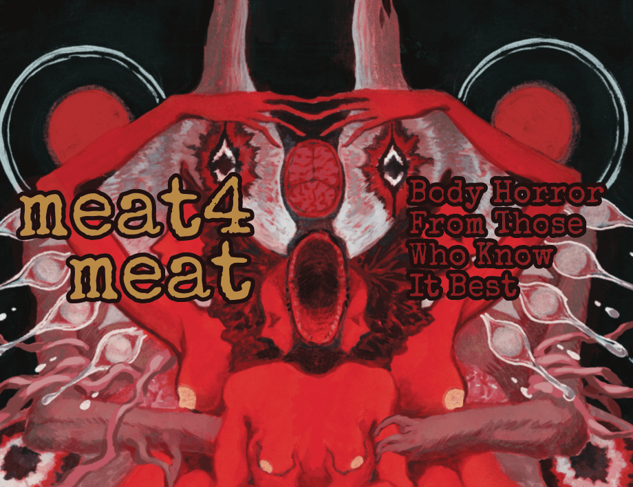 meat4meat is an illustrated short story anthology dedicated to exploring body horror by those who know it best. It is a study in the relationship between discrepancy in self and body, in the horror of losing control, and the joy of taking it back. It’s a celebration of the strange and wonderful. But most of all, meat4meat is a fever dream of an anthology that drags the reader face-first through the guts and gore of world-class body horror.